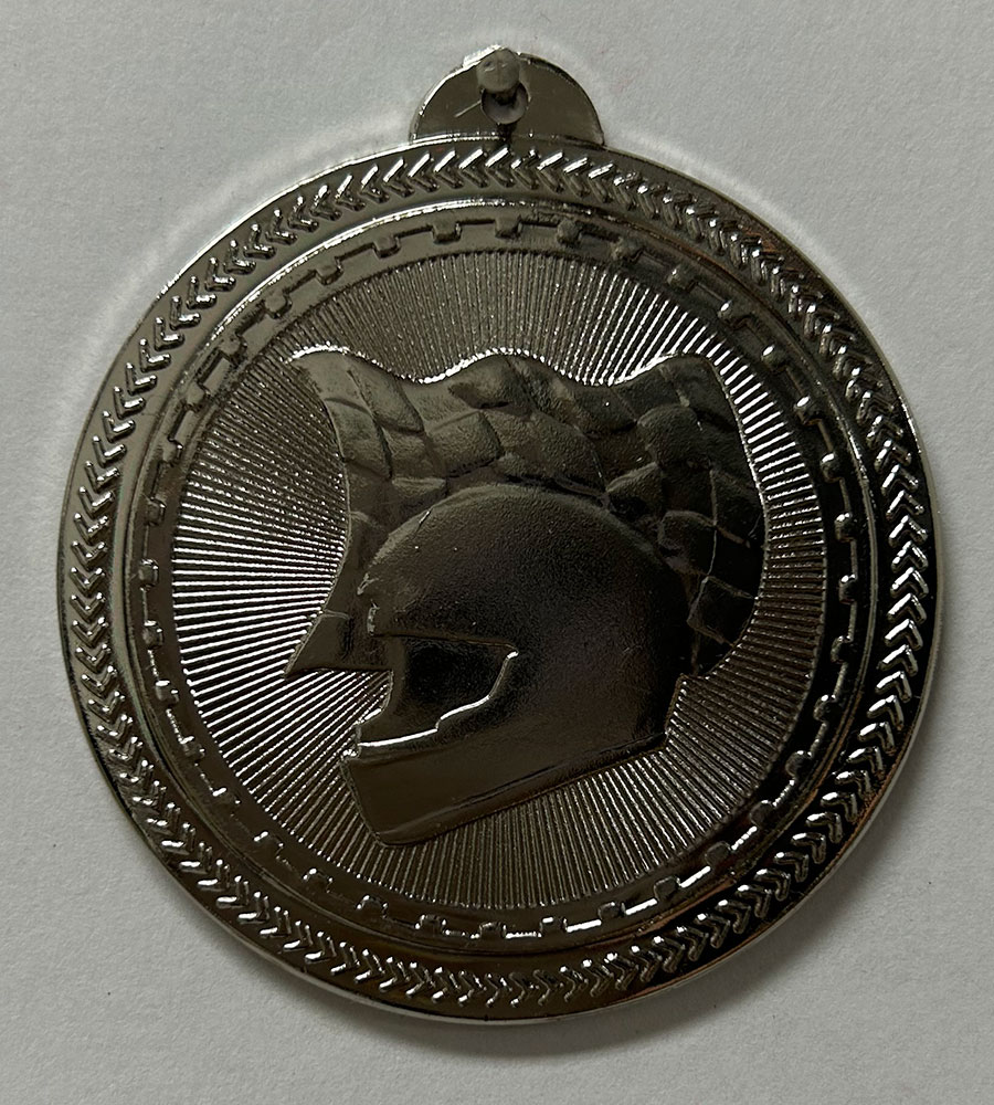 An embossed Football medal depicting a football. The medal is shield shaped and there is a row of stars on the medal.