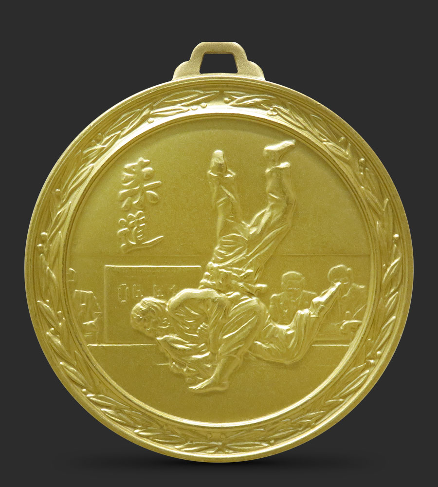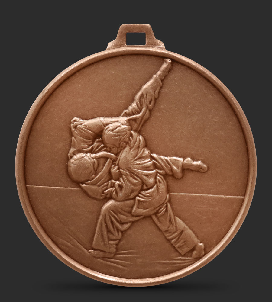 An embossed Martial Arts medal depicting a tunic and belt, with stars around the outside of the medal