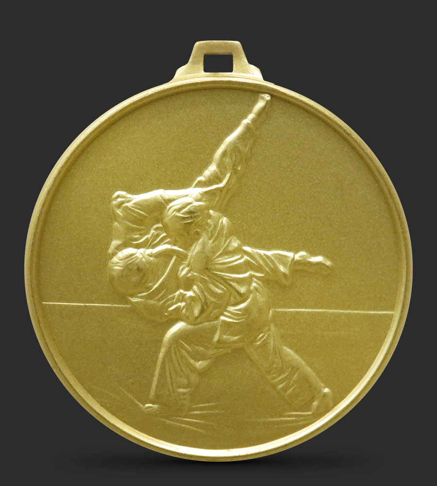 An embossed Martial Arts medal depicting a tunic and belt, with stars around the outside of the medal