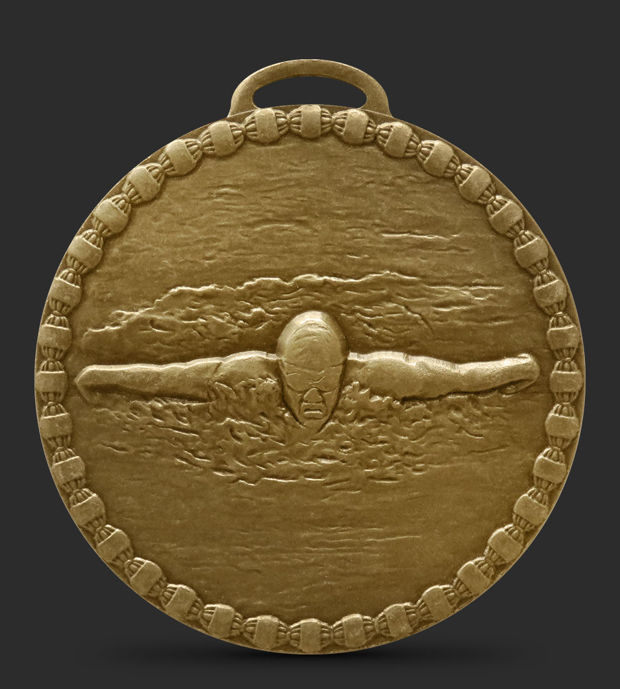 An intricately embossed Swimming medal depicting a male swimmer swimming butterfly, with a buoy border around the edge of the medal.