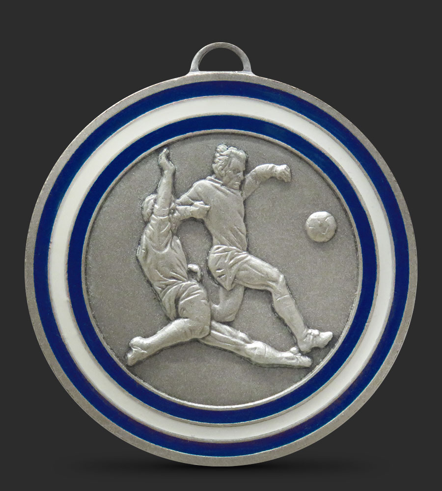 An intricately embossed Football medal depicting two football players in a sliding tackle, with blue and white enamel rings around the edge of the medal.