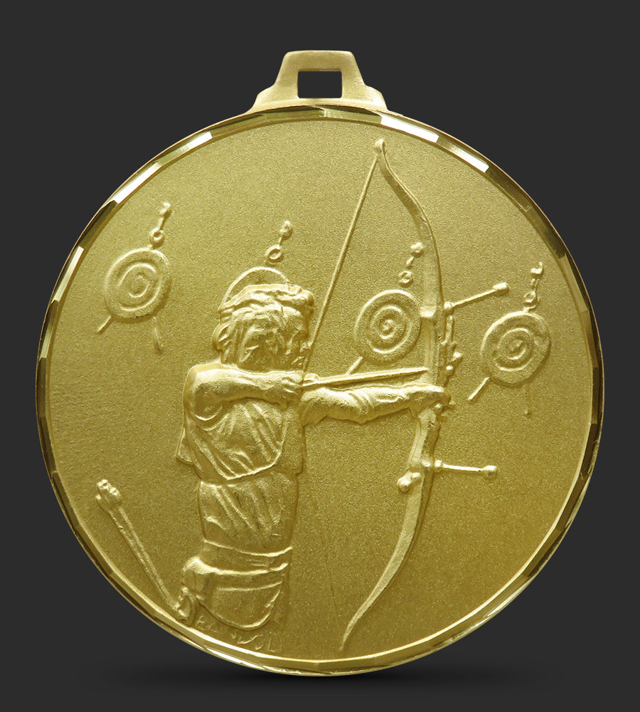 A hand faceted, intricately embossed Brass Archery medal depicting an archer with a bow and arrow, and a row of archery targets.