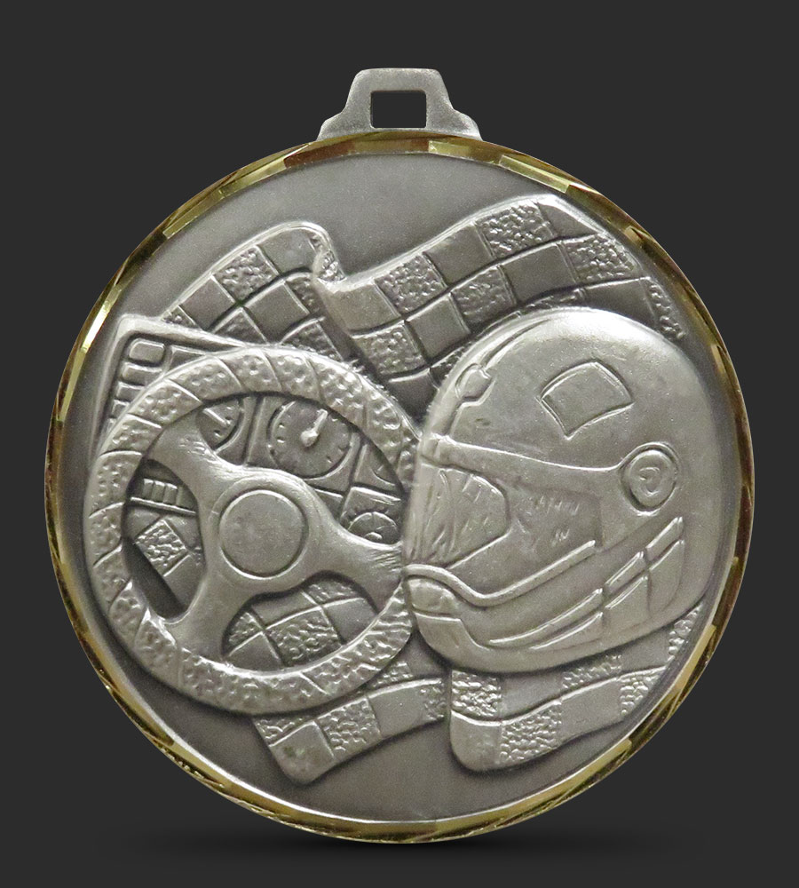 A hand faceted, intricately embossed Brass Car Racing Medal depicting a helmet, steering wheel and dashboard in front of a chequered finish line flag.