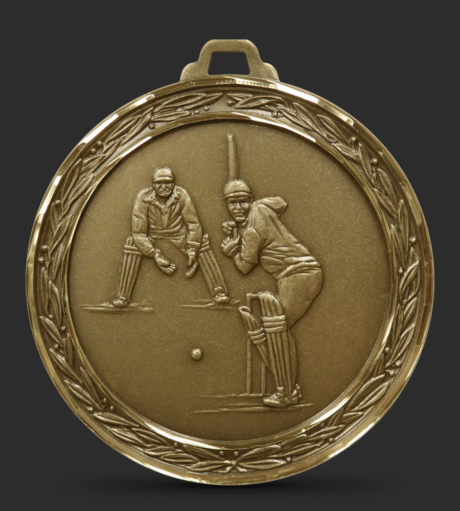 A hand faceted, intricately embossed Brass Cricket Medal depicting a batter and wicket keeper, with a laurel border around the edge of the medal.