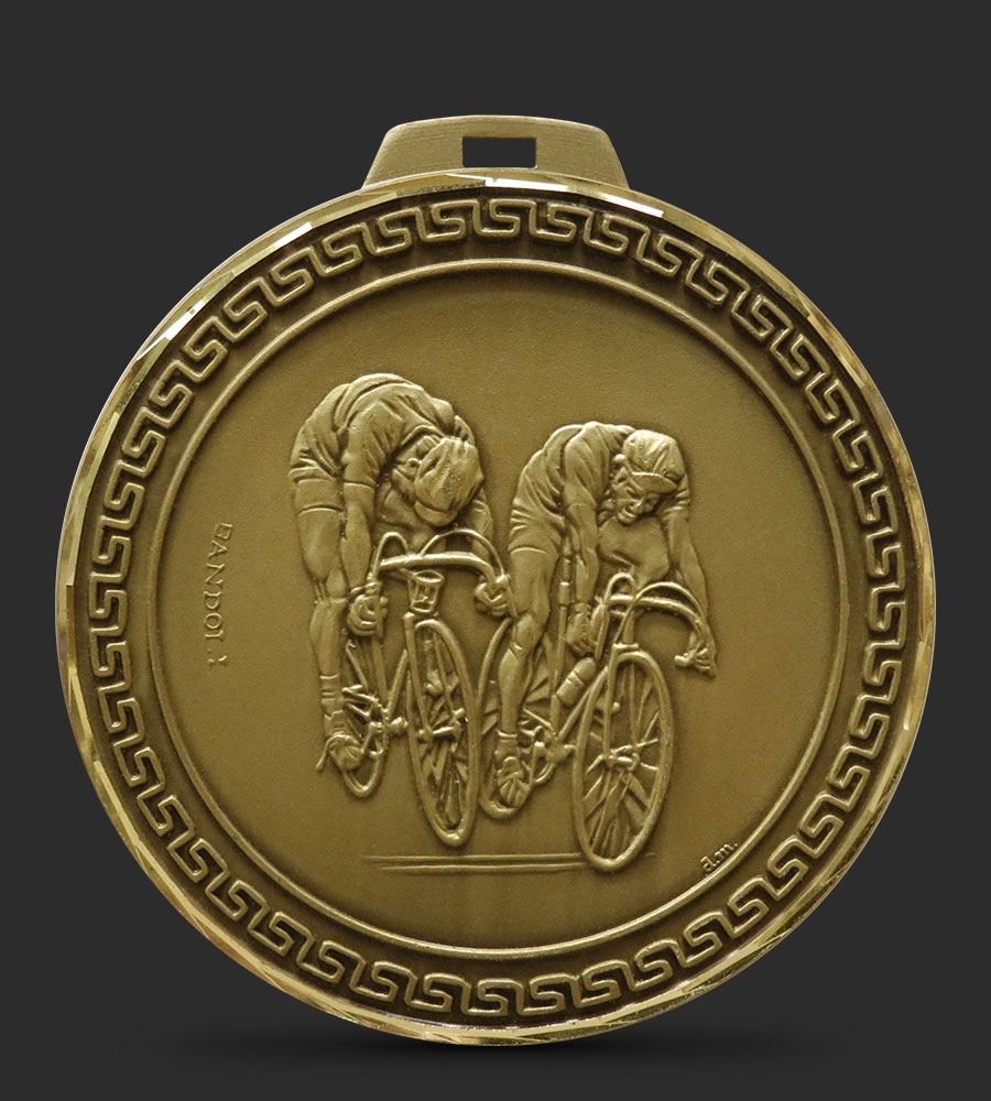 A hand faceted, intricately embossed Brass Cycling medal depicting two cyclists on racing bikes, with a Greek key border around the edge of the medal.
