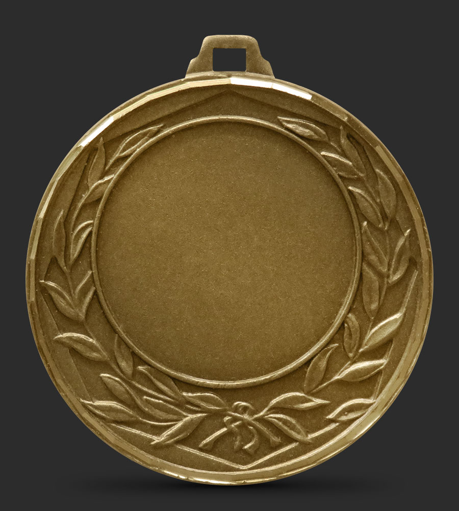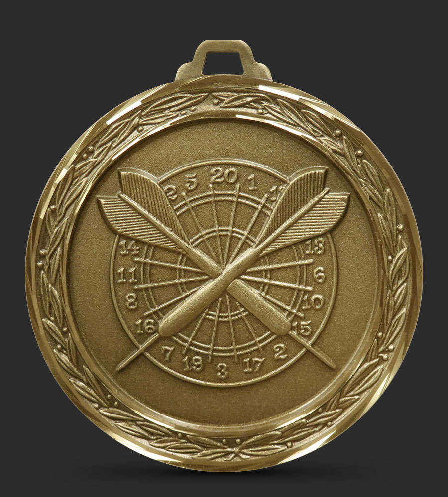 A hand faceted, intricately embossed Brass Darts medal depicting two darts in front of a dartboard, with a laurel border around the edge of the medal.