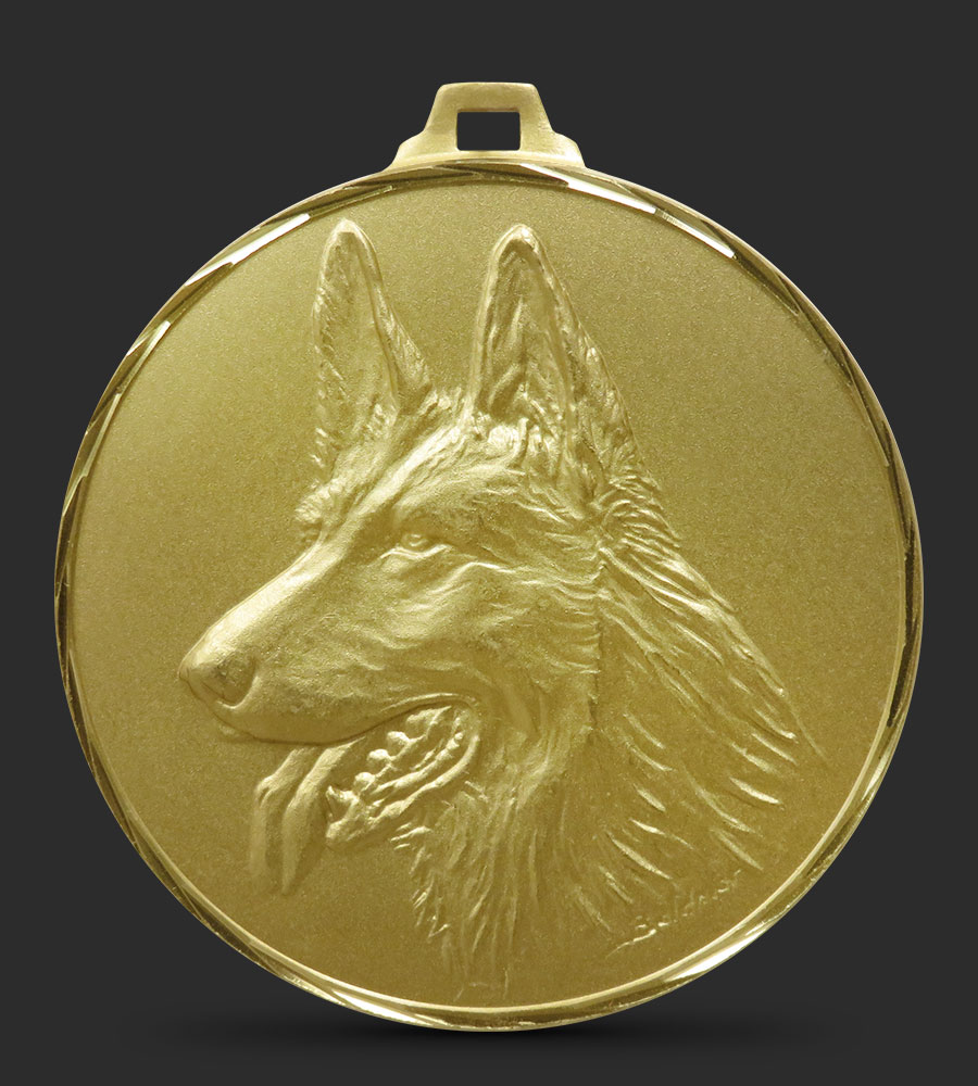 A hand faceted, intricately embossed Brass Dog medal depicting an Alsatian Dog.