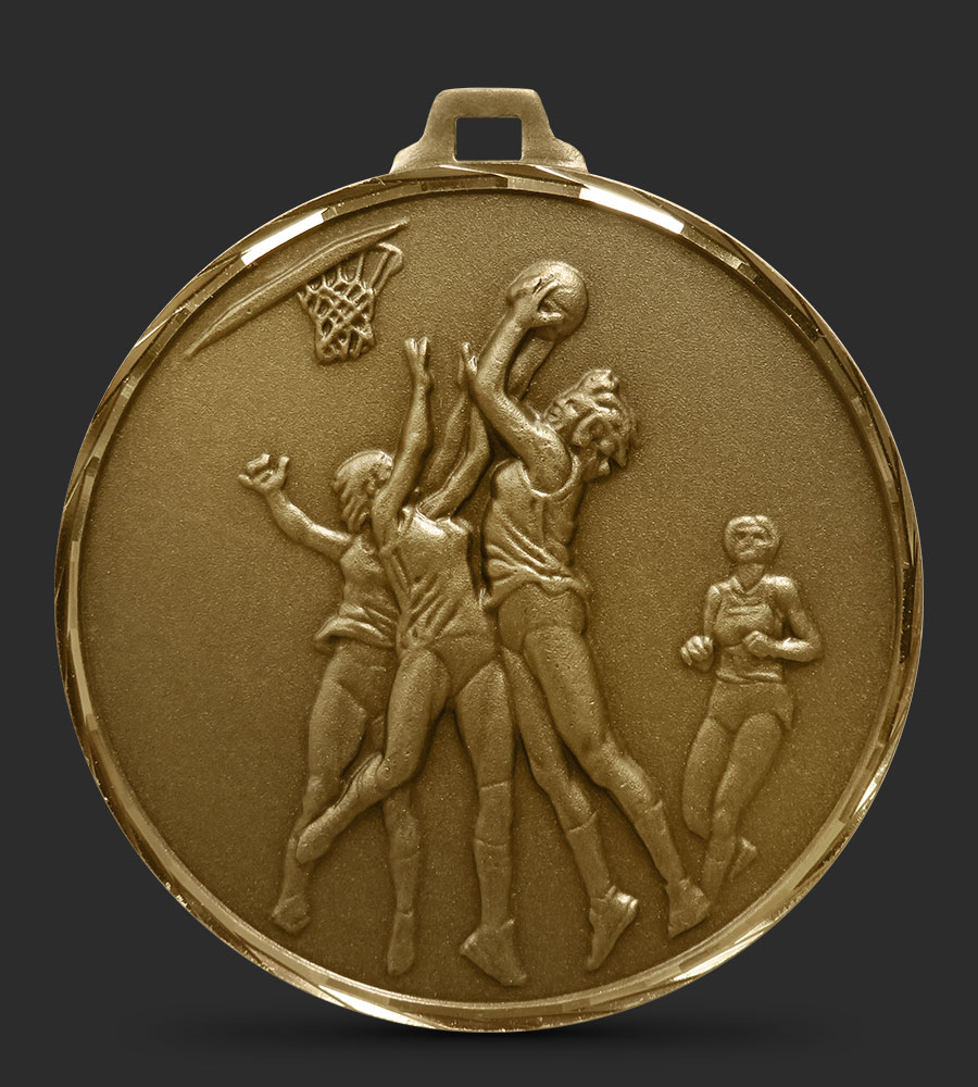 A hand faceted, intricately embossed Brass Basketball medal depicting female basketball players jumping up at a net.