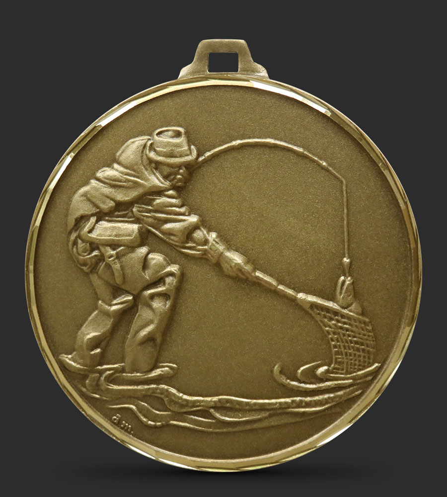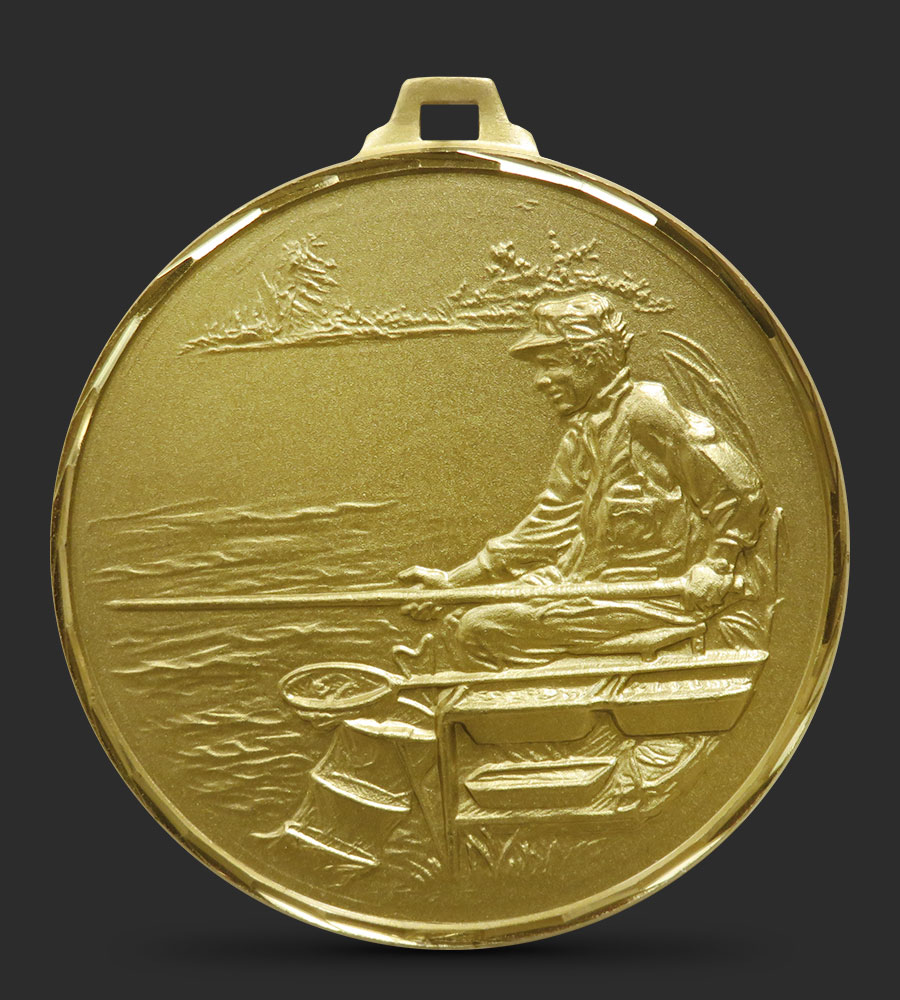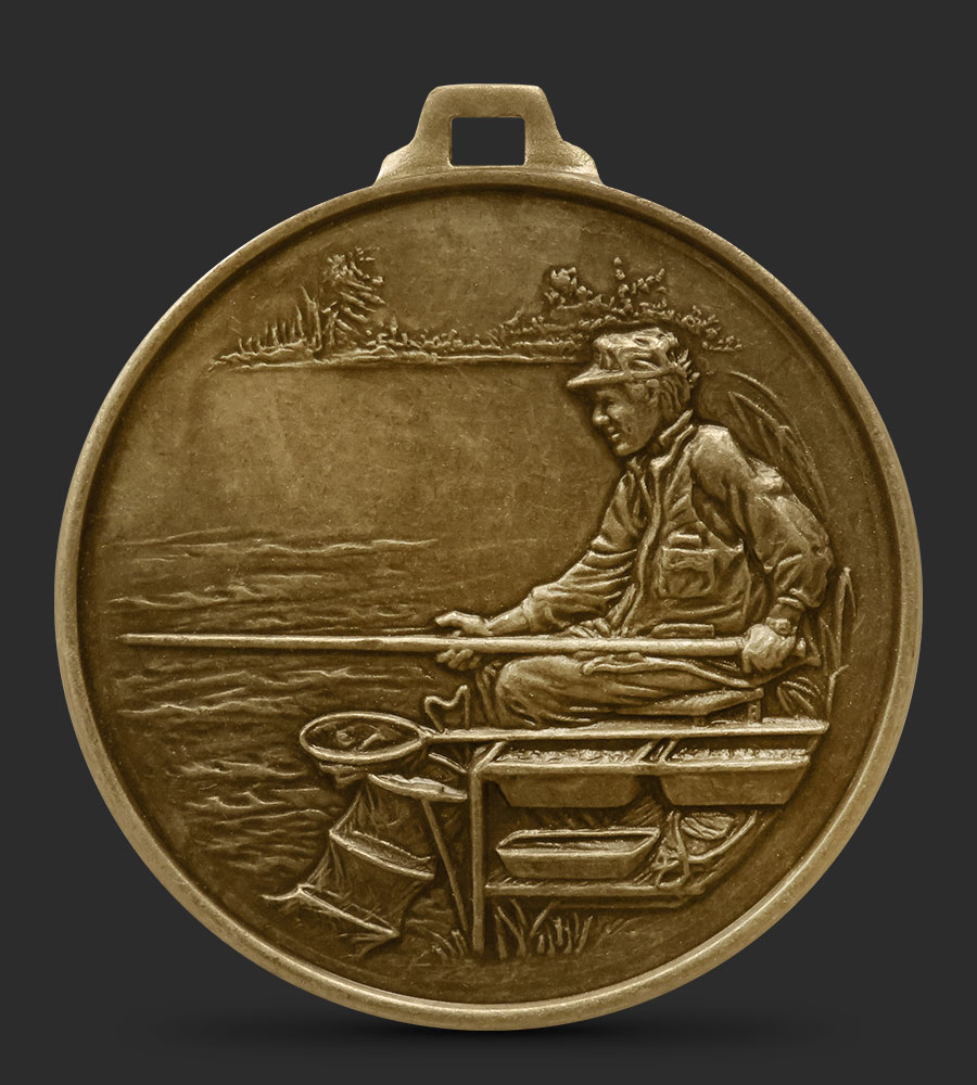 A hand faceted, intricately embossed Brass Fishing medal depicting an angler waiting to catch a fish.