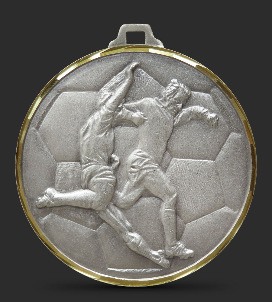 A hand faceted, intricately embossed Brass Football medal depicting a player performing a sliding tackle on another player with a football patterned background.