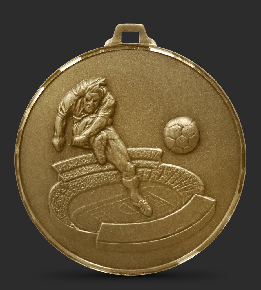 A hand faceted, intricately embossed Brass Football medal depicting a player kicking a ball with a football stadium in the background.