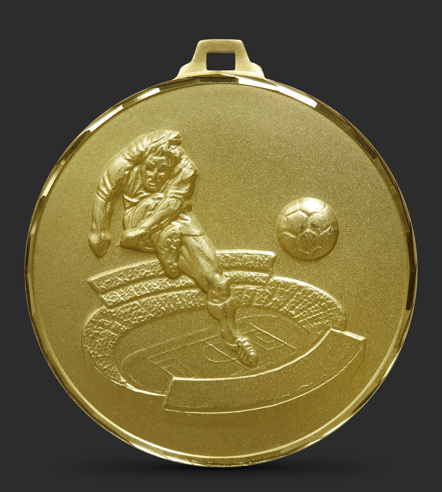 A hand faceted, intricately embossed Brass Football medal depicting a player kicking a ball with a football stadium in the background.