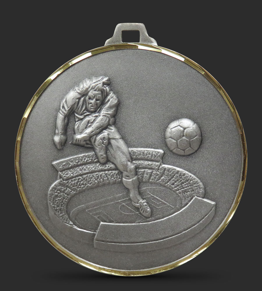 A hand faceted, intricately embossed Brass Football medal depicting a player kicking a ball with a football stadium in the background.