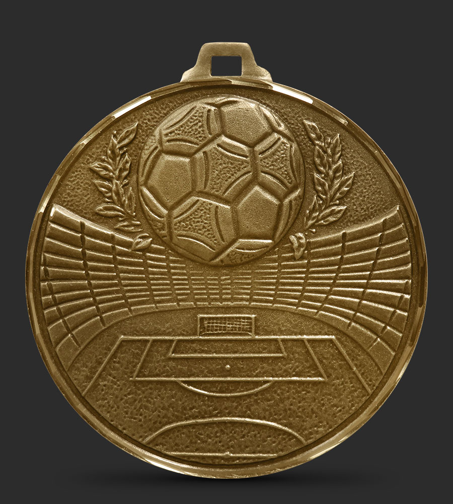 A hand faceted, intricately embossed Brass Football medal depicting a a football surrounded by laurel leaves, with football stadium in the background.