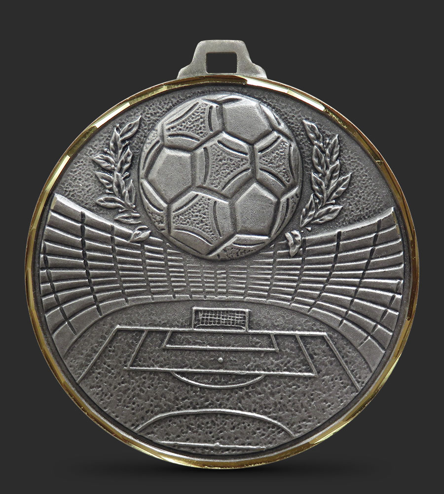 A hand faceted, intricately embossed Brass Football medal depicting a a football surrounded by laurel leaves, with football stadium in the background.