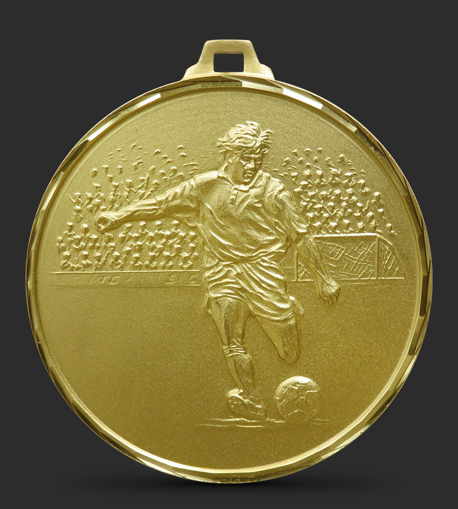 A hand faceted, intricately embossed Brass Football medal depicting a player kicking a ball with a football stadium in the background.
