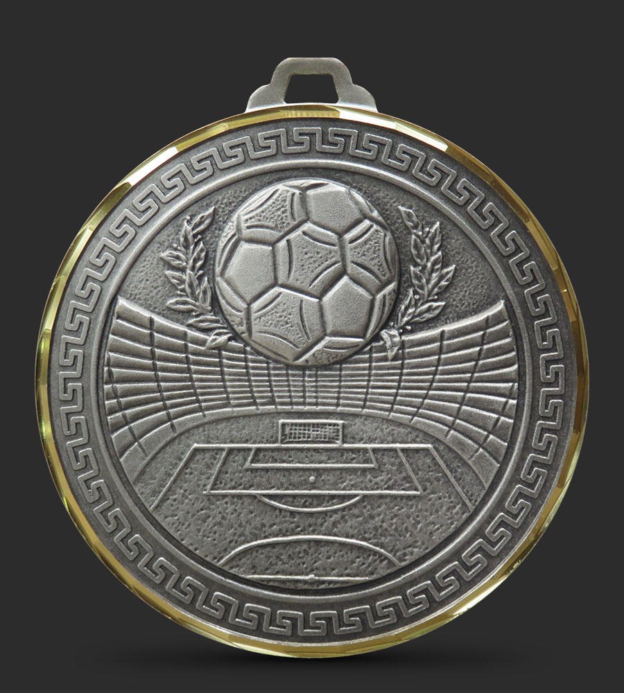 A hand faceted, intricately embossed Brass Football medal depicting a football, laurel leaves, with football stadium in the background and a Greek key border around the edge of the medal.