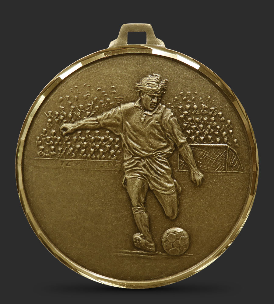 A hand faceted, intricately embossed Brass Football medal depicting a player kicking a ball with a football stadium in the background.