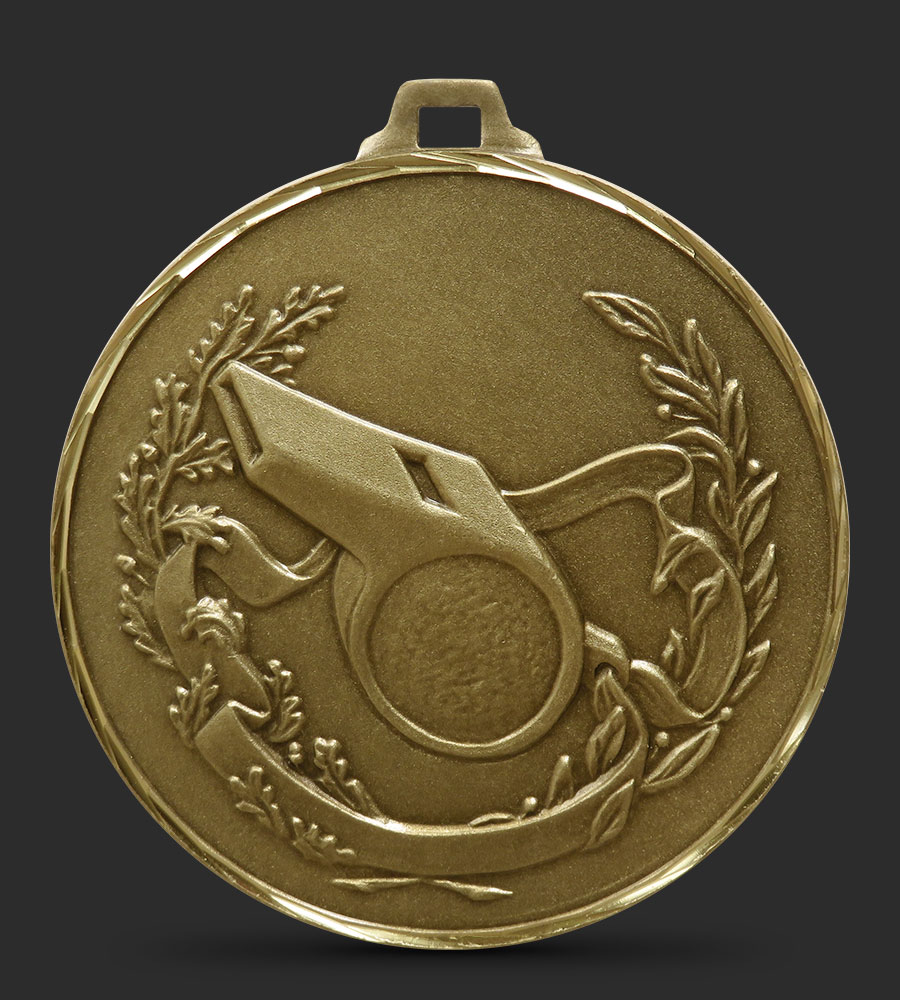 A hand faceted, intricately embossed Brass Referee Medal depicting a referee whistle on a lanyard, with a laurel around the edge of the medal.