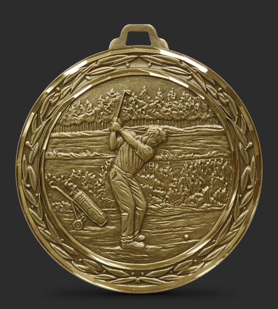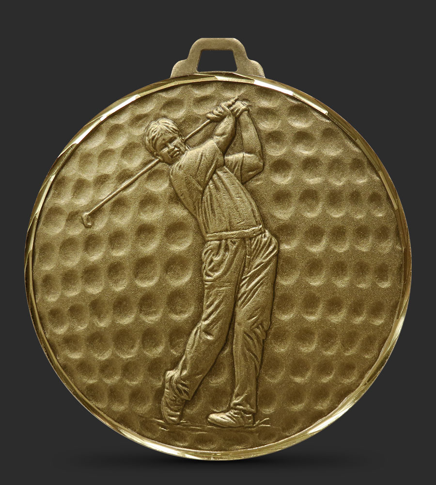 A hand faceted, intricately embossed Brass Golf Medal depicting a male golfer with a golf ball effect background.