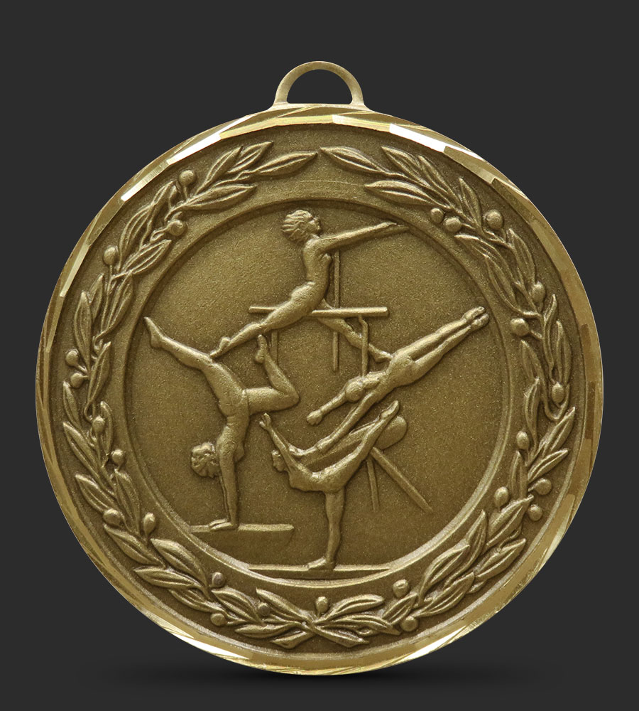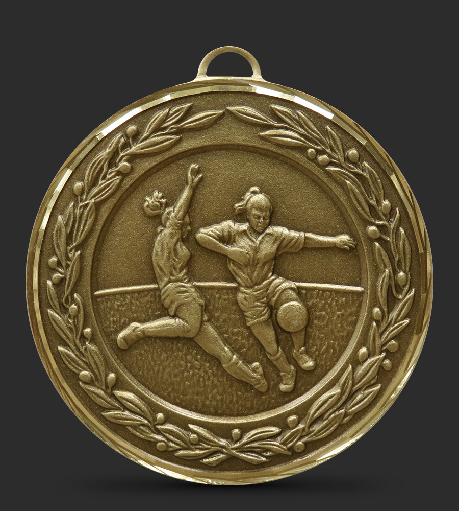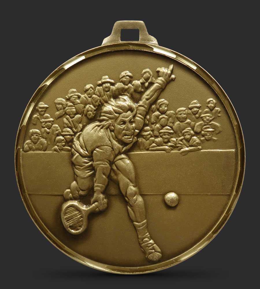 A hand faceted, intricately embossed Brass Tennis medal depicting a male tennis player hitting a ball in front of a crowd.