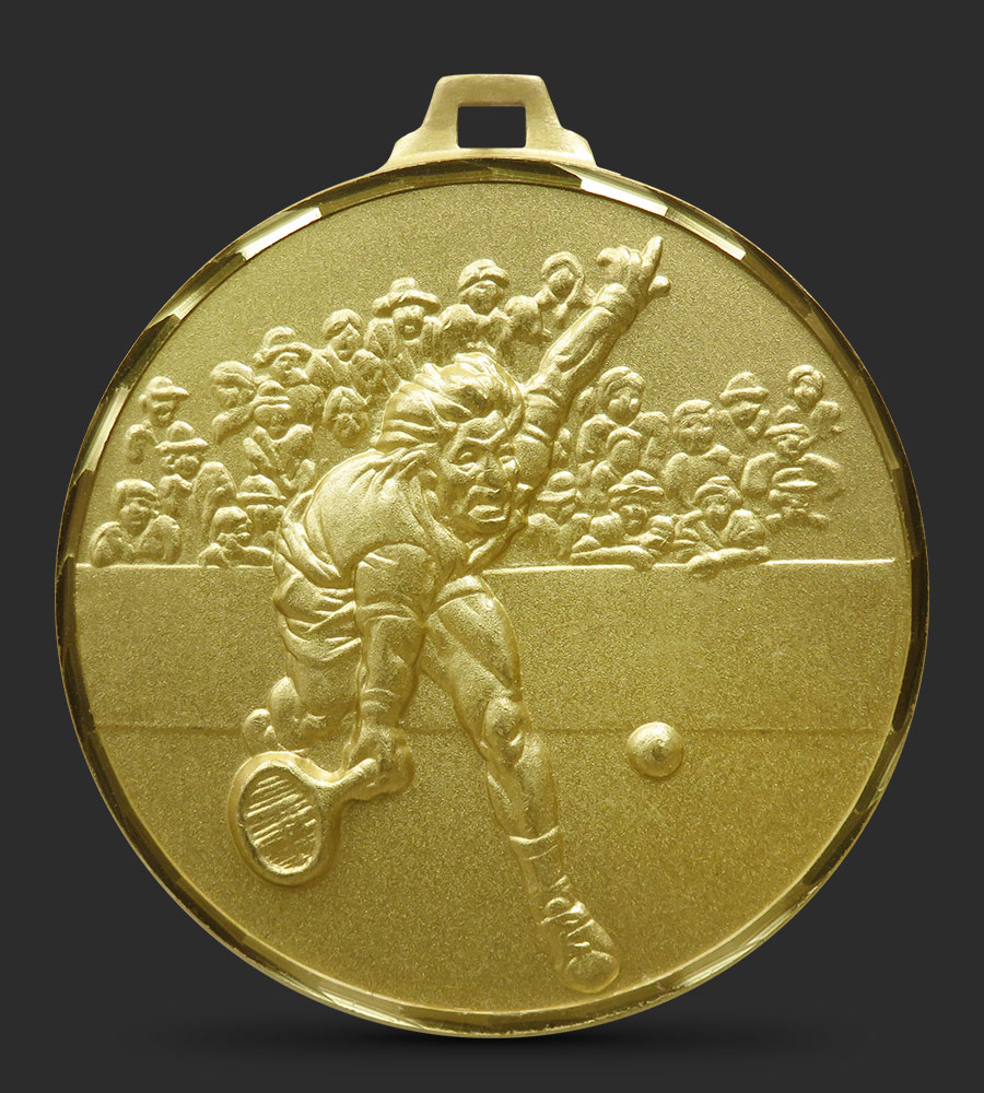 A hand faceted, intricately embossed Brass Tennis medal depicting a male tennis player hitting a ball in front of a crowd.