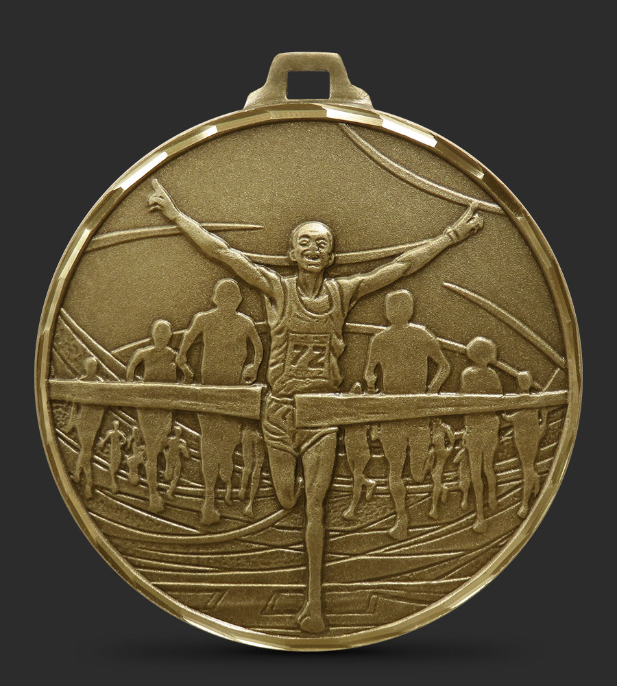 A hand faceted, intricately embossed Brass Marathon Medal depicting a runner crossing the finish line.