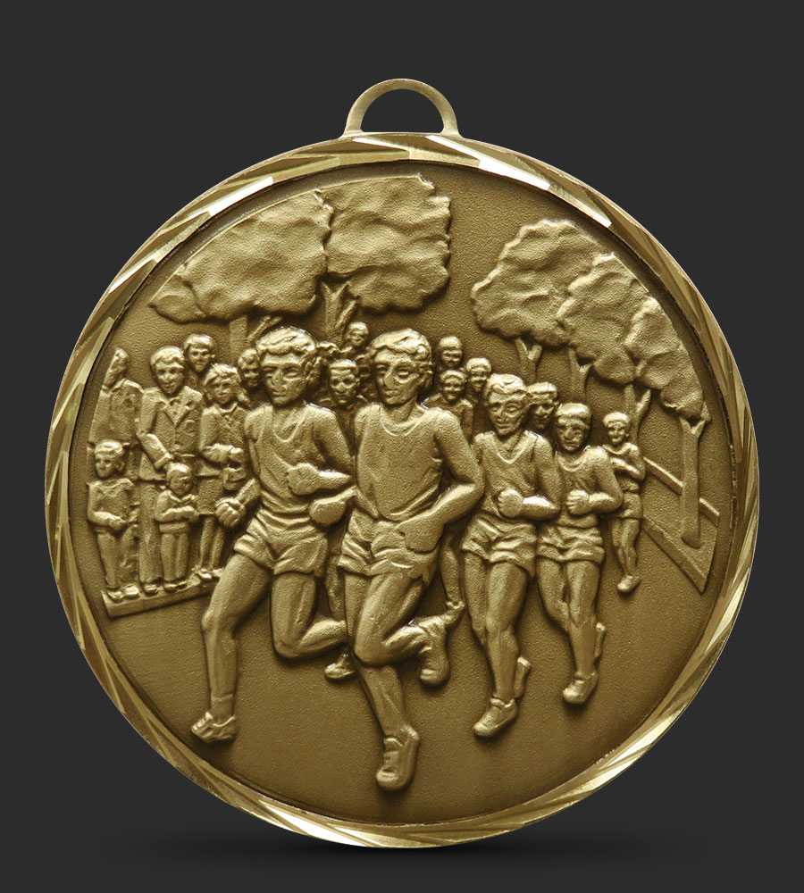 A hand faceted, intricately embossed Brass Fun Run Medal depicting a large group of runners and spectators.