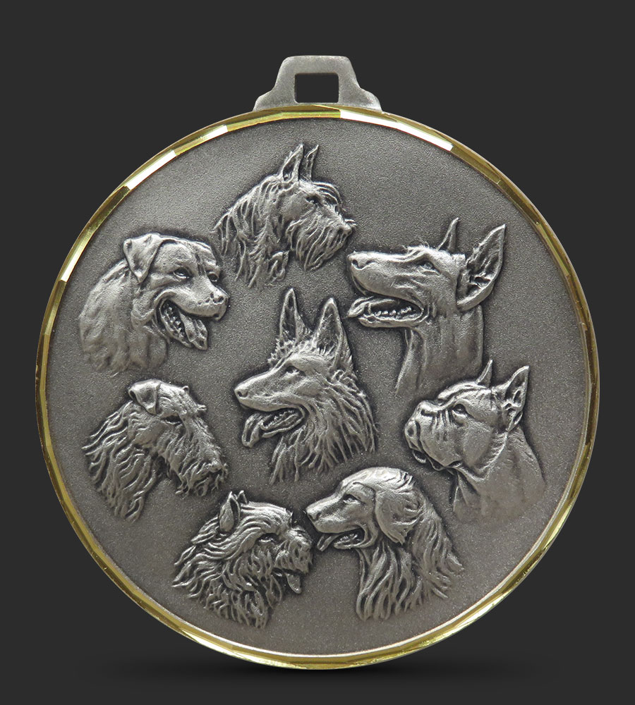 A hand faceted, intricately embossed Brass Multi Dog medal depicting several different dog breeds.
