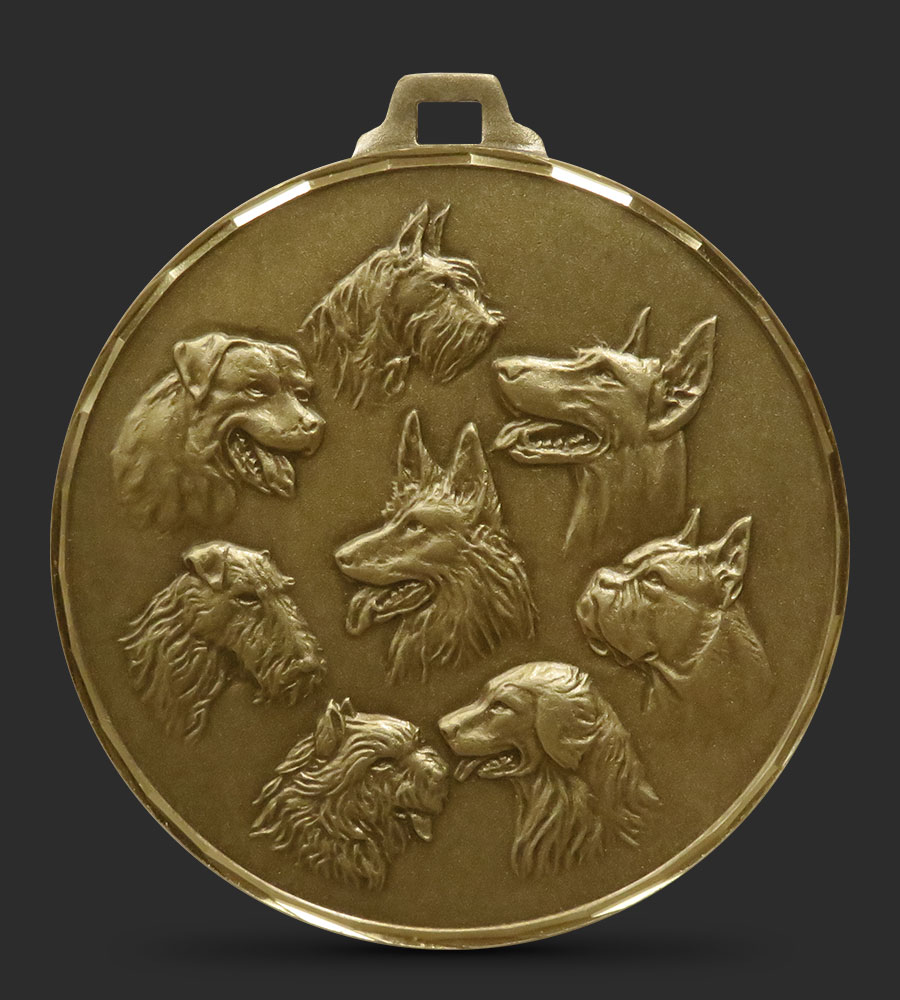 A hand faceted, intricately embossed Brass Multi Dog medal depicting several different dog breeds.