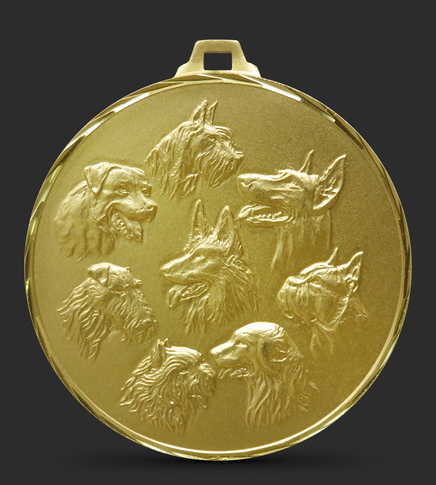 A hand faceted, intricately embossed Brass Multi Dog medal depicting several different dog breeds.