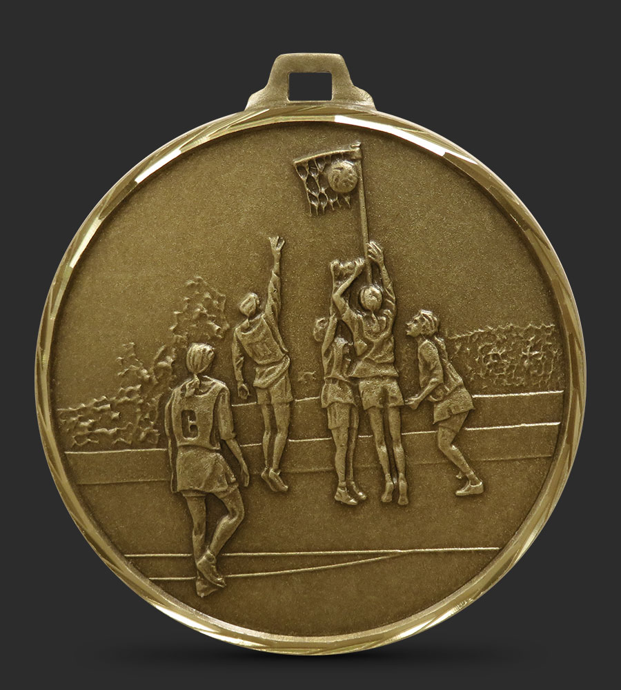 A hand faceted, intricately embossed Brass Netball medal depicting netball players throwing a ball at a net.
