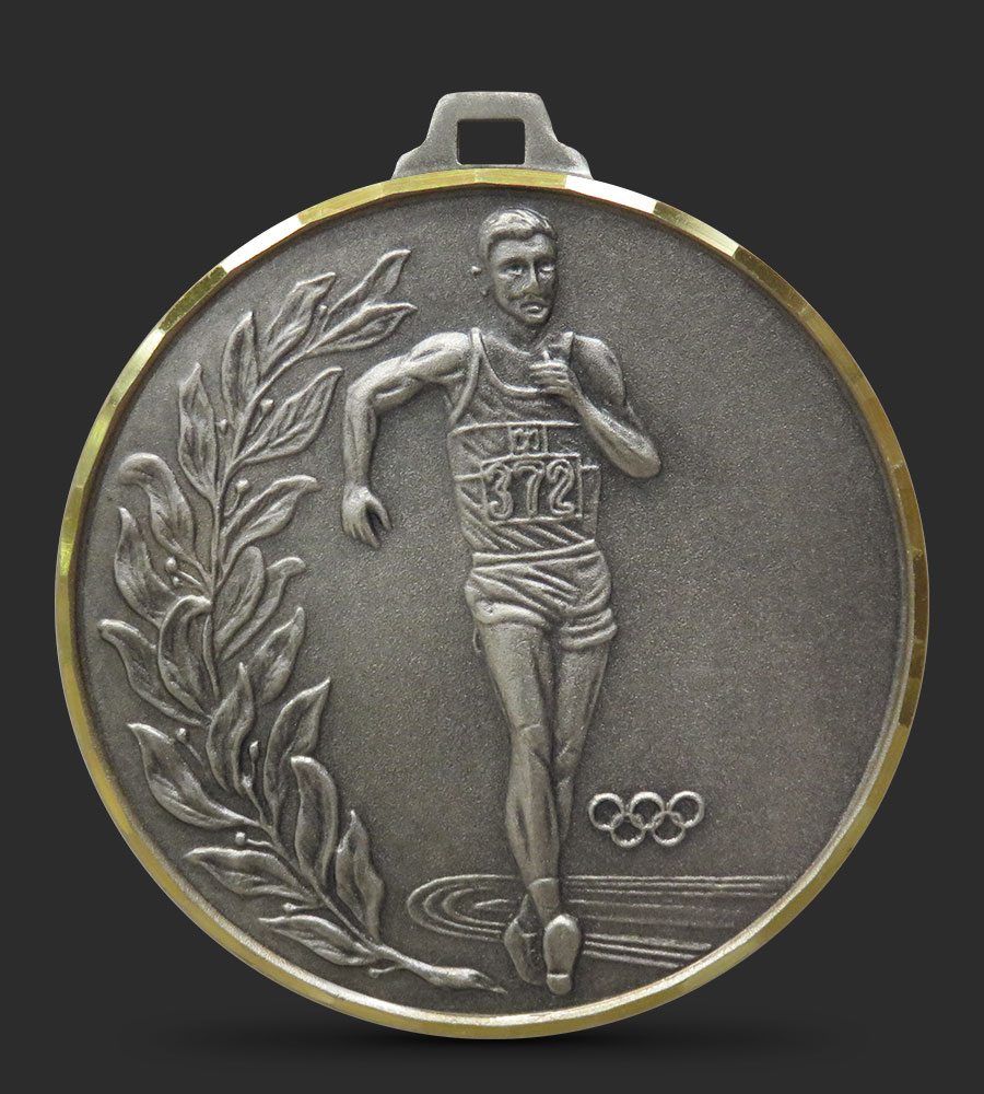 A hand faceted, intricately embossed Brass Walking Olympic Medal with Olympic rings and laurel leaves.