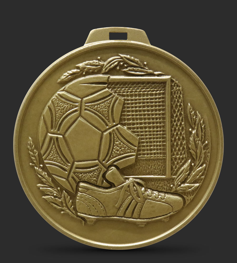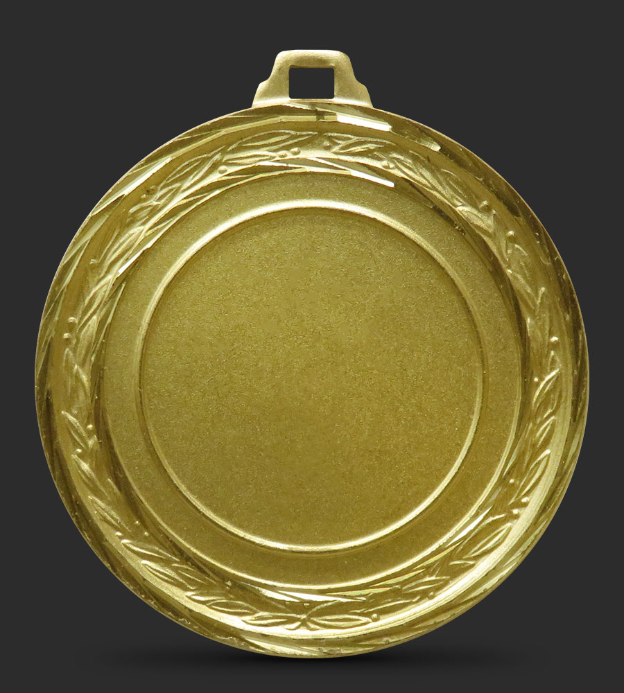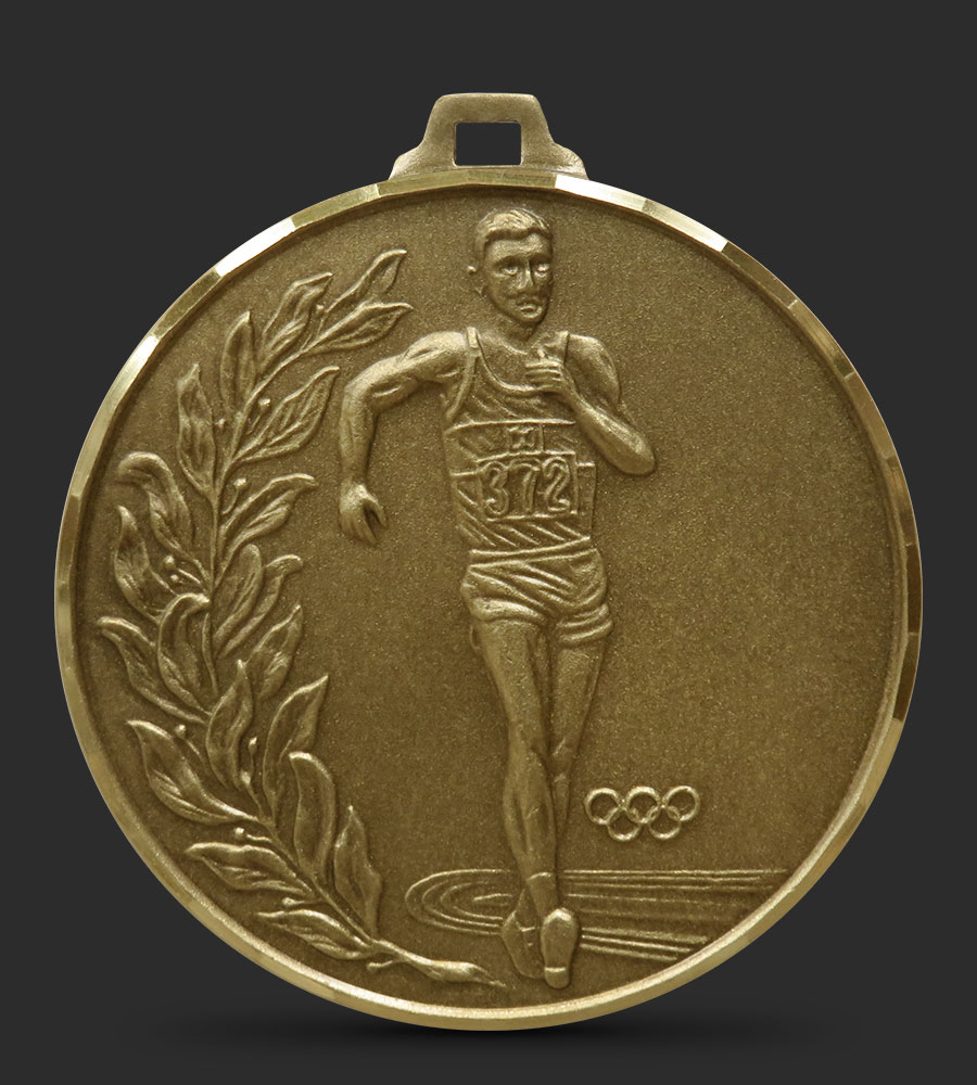 A hand faceted, intricately embossed Brass Walking Olympic Medal with Olympic rings and laurel leaves.