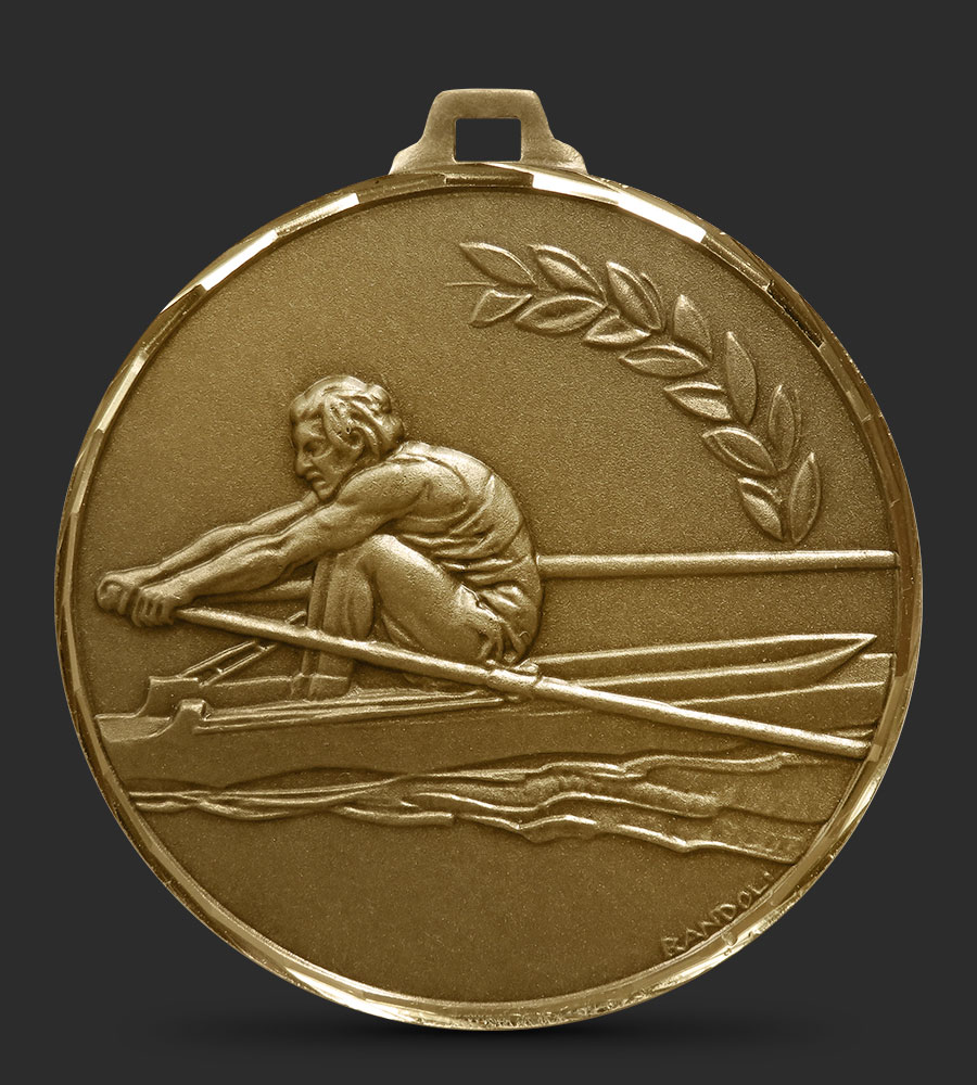 A hand faceted, intricately embossed Brass Rowing medal depicting a rower on a boat with a laurel detail.