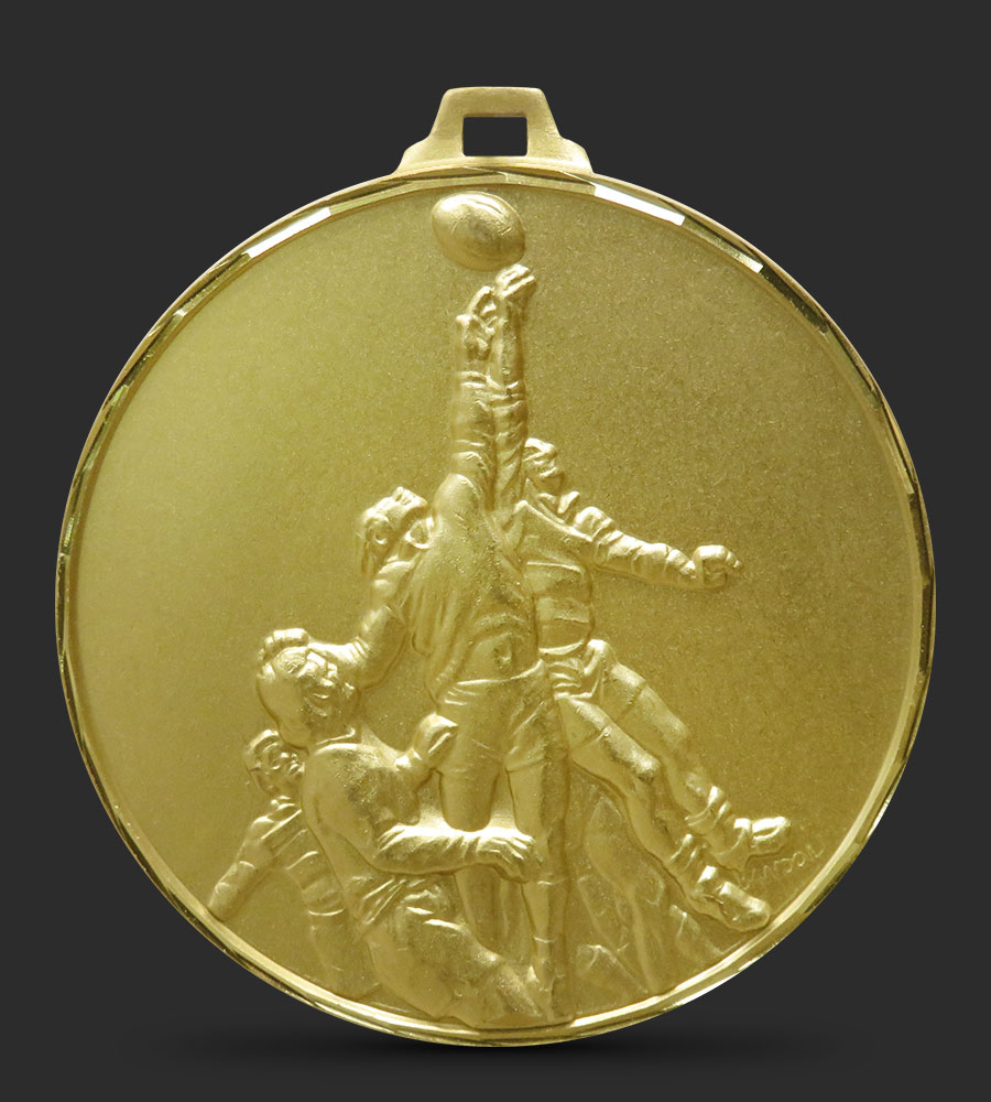 A hand faceted, intricately embossed Brass Rugby medal depicting several players taking part in a lineout.