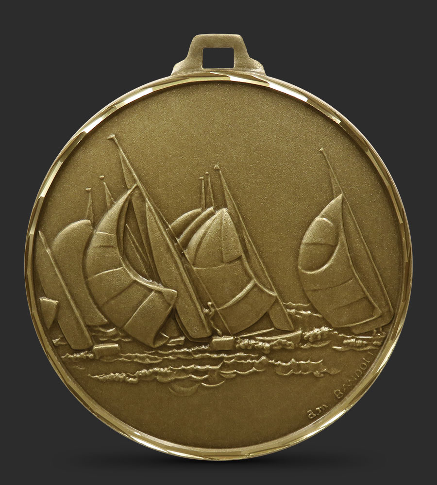 A hand faceted, intricately embossed Brass Sailing medal depicting several sailing boats.
