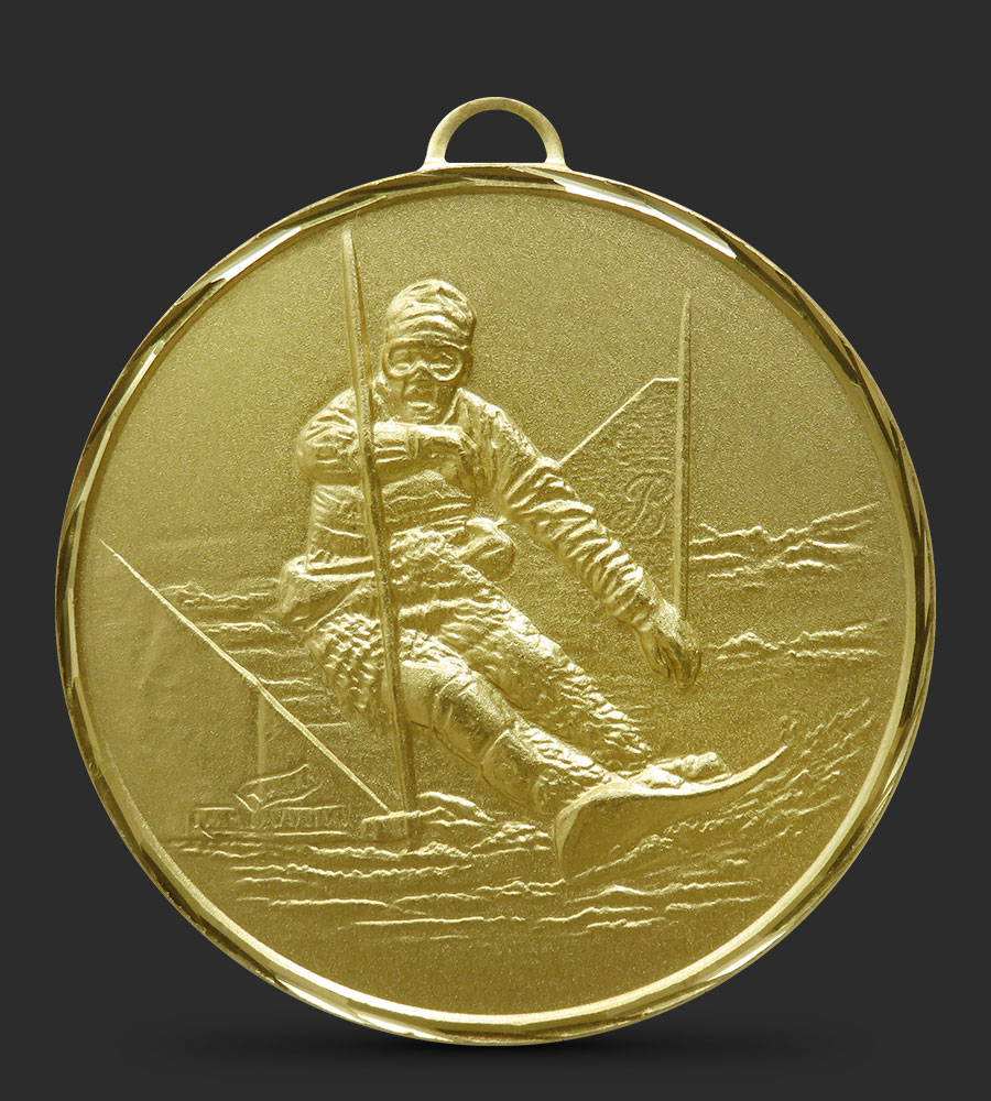 A hand faceted, intricately embossed Brass Skiing medal depicting a skier skiing around a pole.