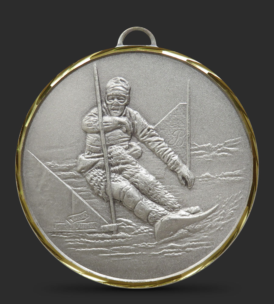 A hand faceted, intricately embossed Brass Skiing medal depicting a skier skiing around a pole.