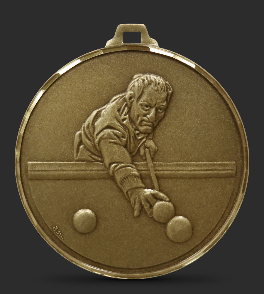 A hand faceted, intricately embossed Brass Snooker medal depicting a snooker player lining up a shot.