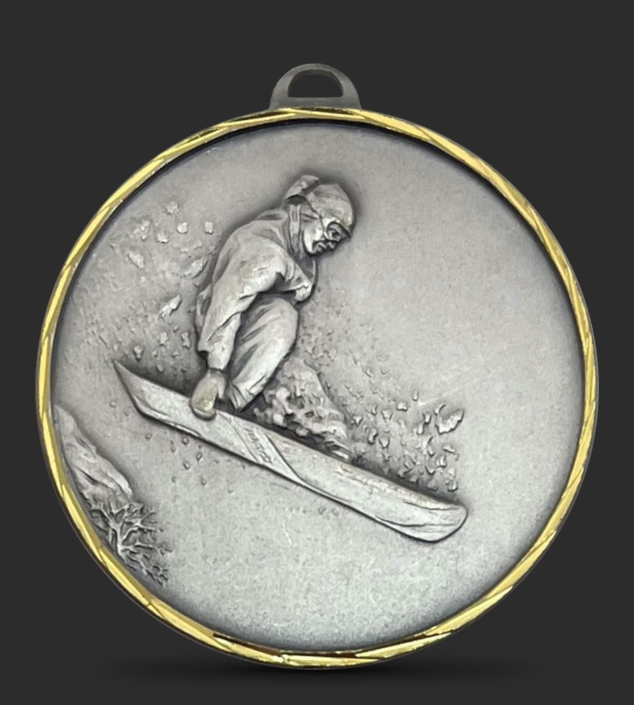 A brass hand faceted medal depicting a snow boarder making a jump going down a snow slope.