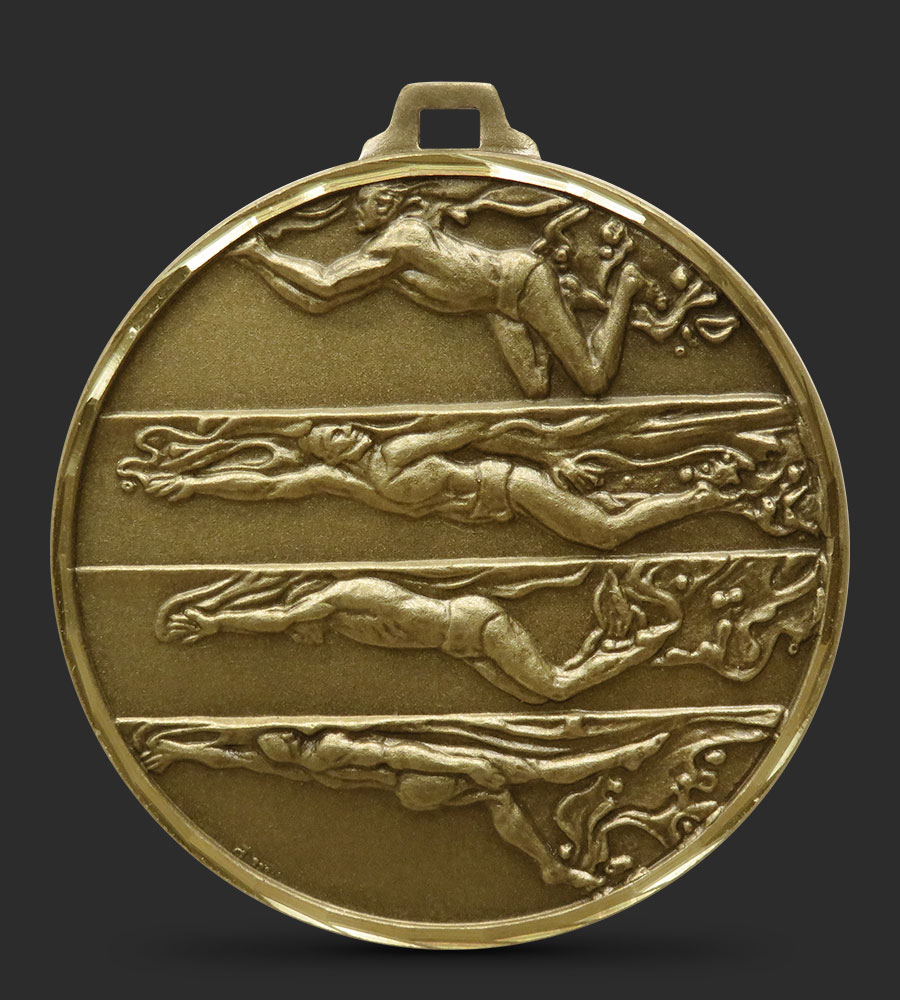A hand faceted, intricately embossed Brass Swimming medal depicting male swimmers swimming crawl, breaststroke, butterfly and backstroke.