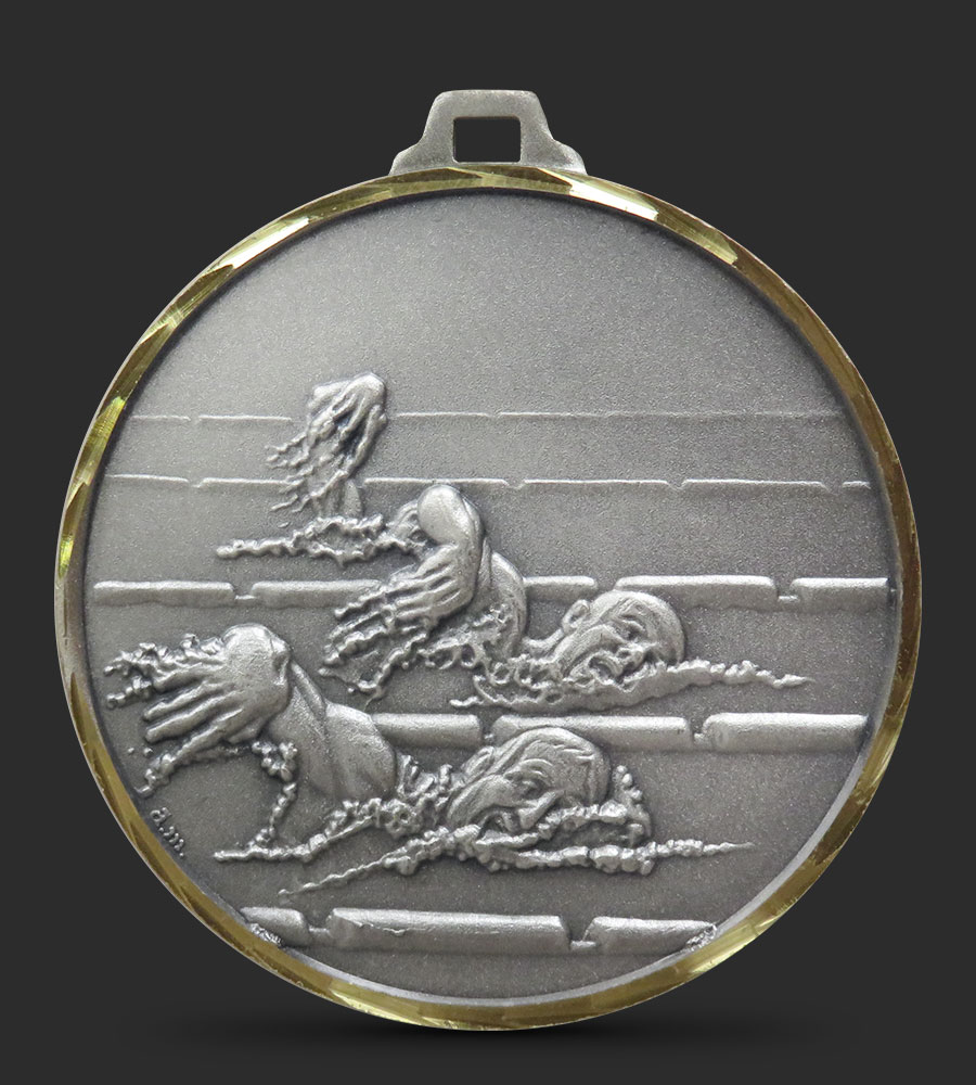 A hand faceted, intricately embossed Brass Swimming medal depicting two male swimmers swimming crawl.