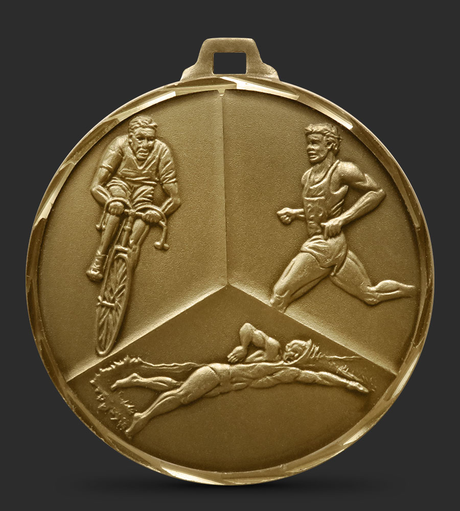 A hand faceted, intricately embossed Brass Triathlon Medal depicting a runner, swimmer and cyclist.