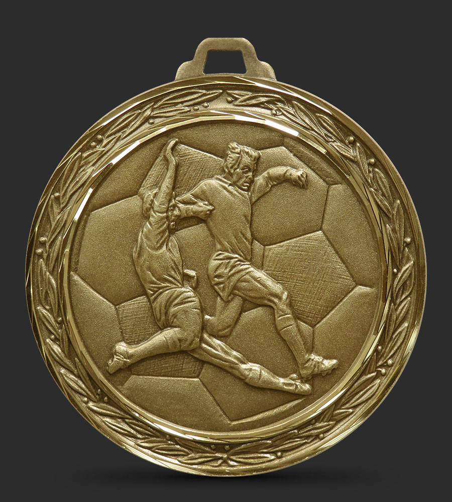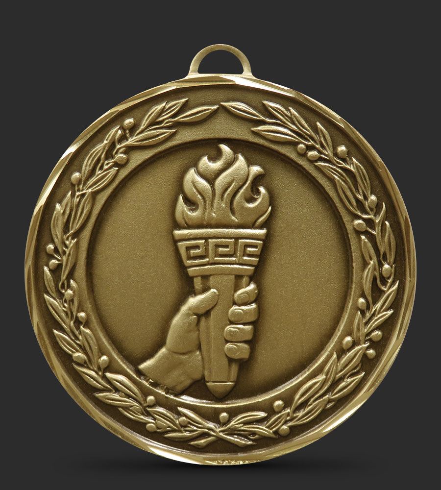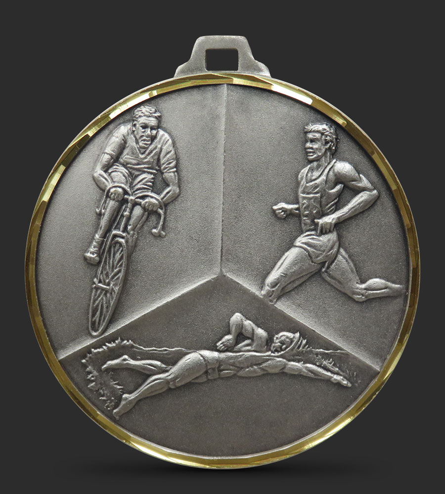 A hand faceted, intricately embossed Brass Triathlon Medal depicting a runner, swimmer and cyclist.
