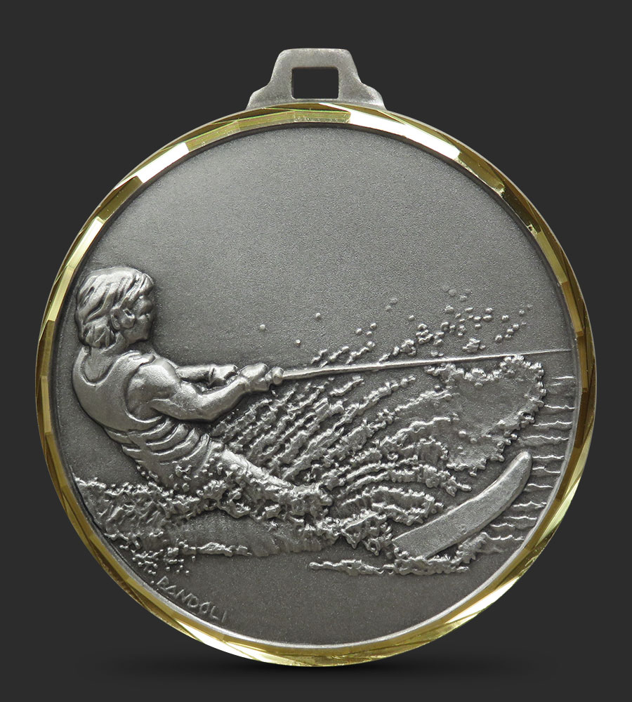 A hand faceted, intricately embossed Brass Water Ski medal depicting a water skier.