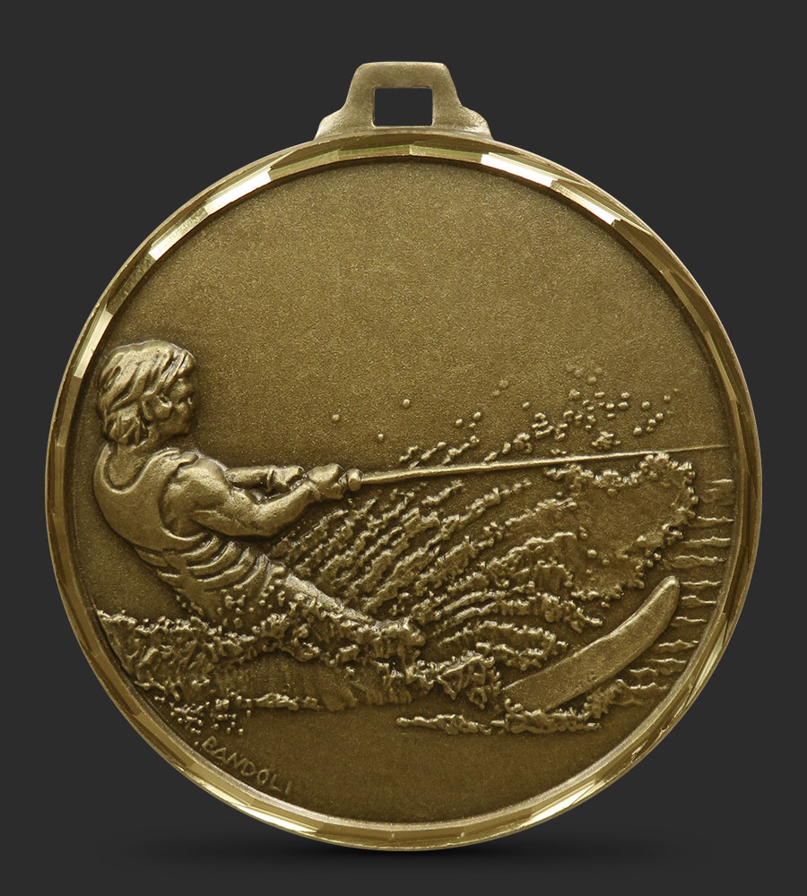 A hand faceted, intricately embossed Brass Water Ski medal depicting a water skier.