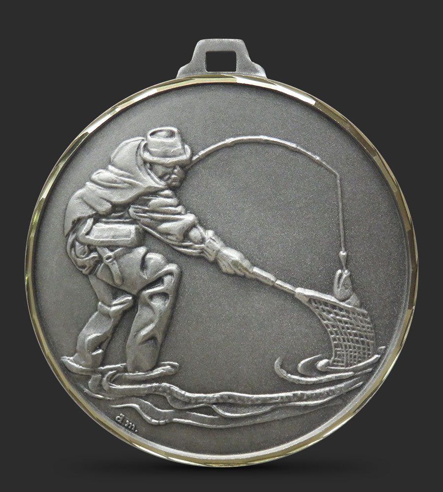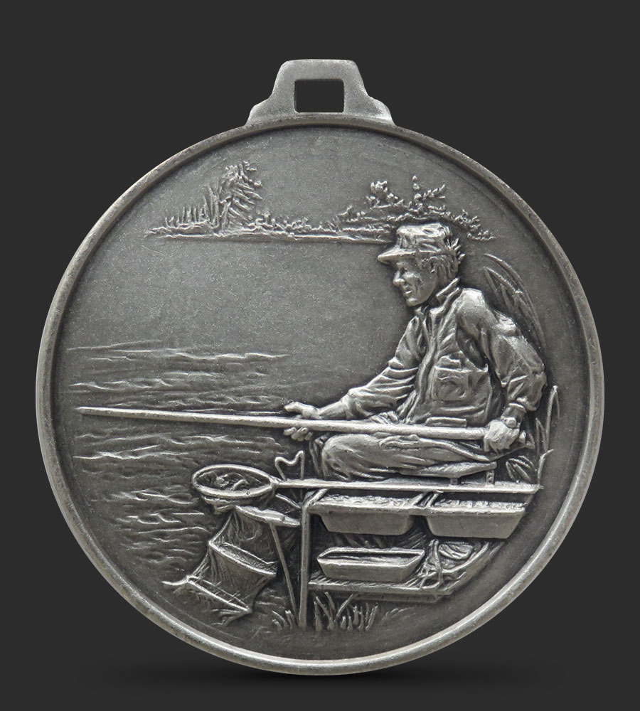 An intricately embossed Fishing medal depicting an angler waiting to catch a fish.