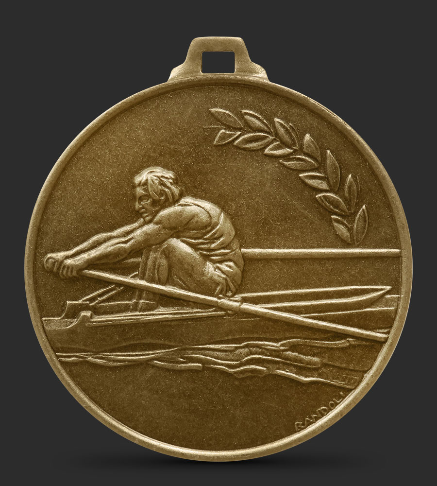 An intricately embossed Rowing medal depicting a rower on a boat with a laurel detail.
