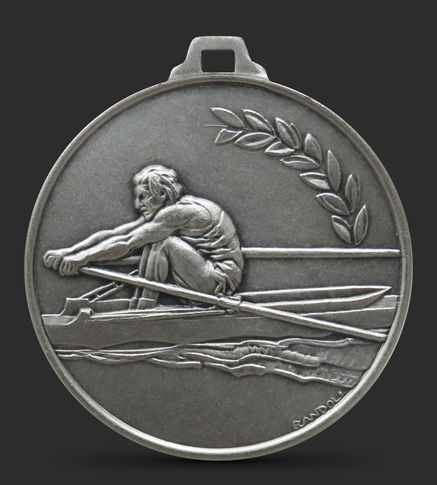 An intricately embossed Rowing medal depicting a rower on a boat with a laurel detail.